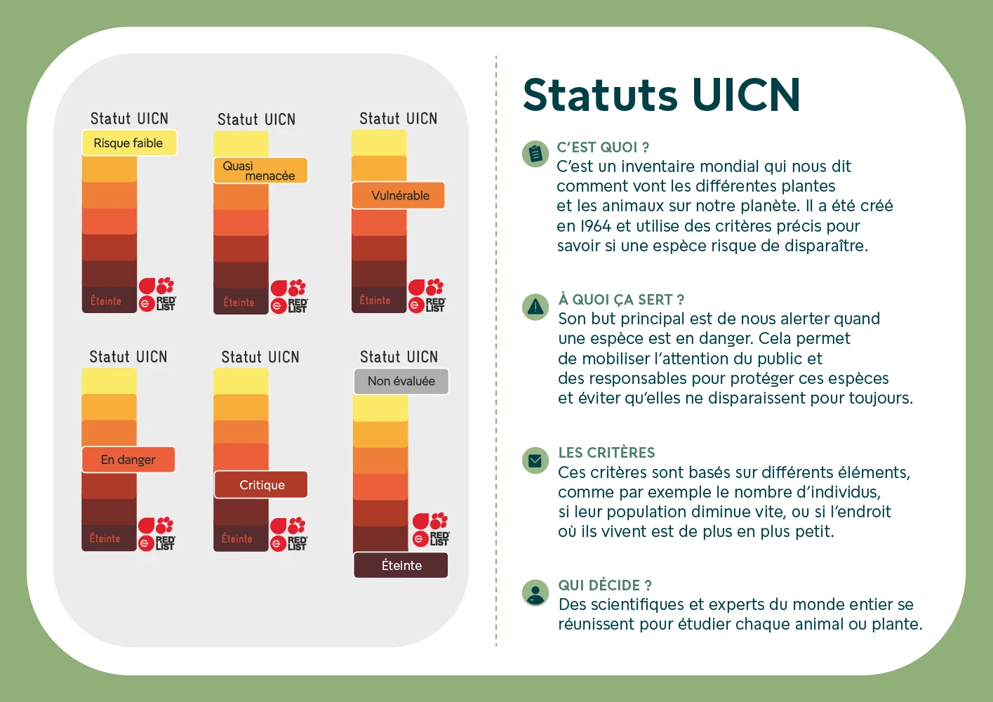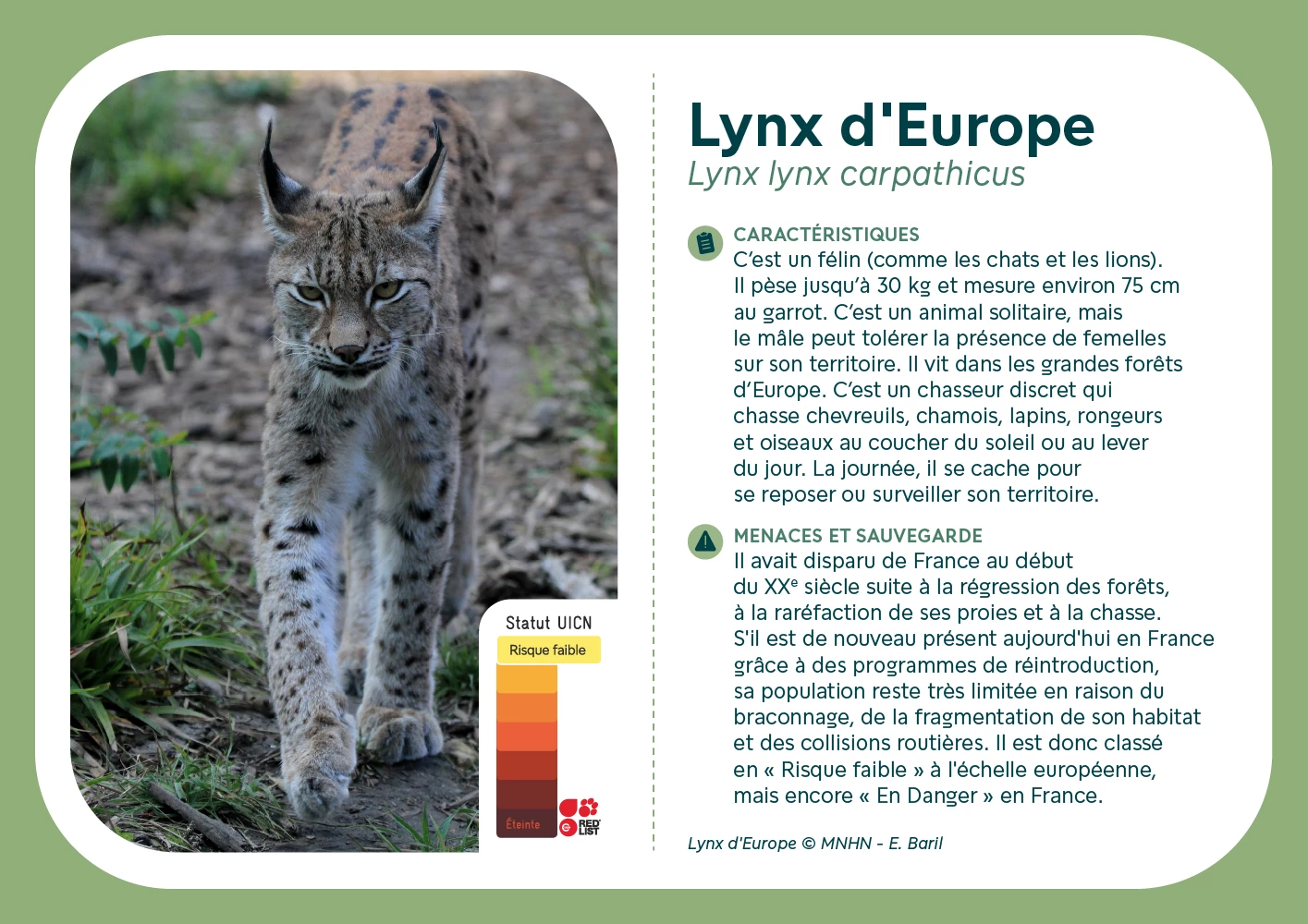 Félicitations ! Vous avez compris que le statut UICN sert à protéger les espèces menacées, comme le lynx ou les lémuriens.