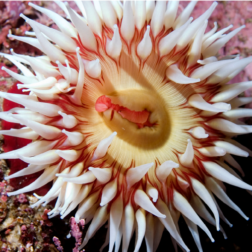L’anémone vie fixée. Elle se nourrit grâce à ses tentacules urticants. Au contact d’une proie, ils peuvent l’empoisonner ou la paralyser. Contrairement à ce qu’on pourrait penser, l’anémone est un animal.
