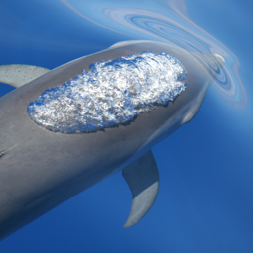 Ce dauphin est un mammifère : il respire donc avec des poumons. Il inspire l’air en surface et l’expire par un évent. La femelle possède aussi des mamelles pour allaiter ses petits.