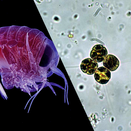 Ce sont des petites bêtes à gauche et des plantes à droite ! Le plancton est composé à la fois d’animaux (crevettes ou larves d’autres animaux) appelés zooplanctons et de végétaux (microalgues) appelés phytoplanctons.