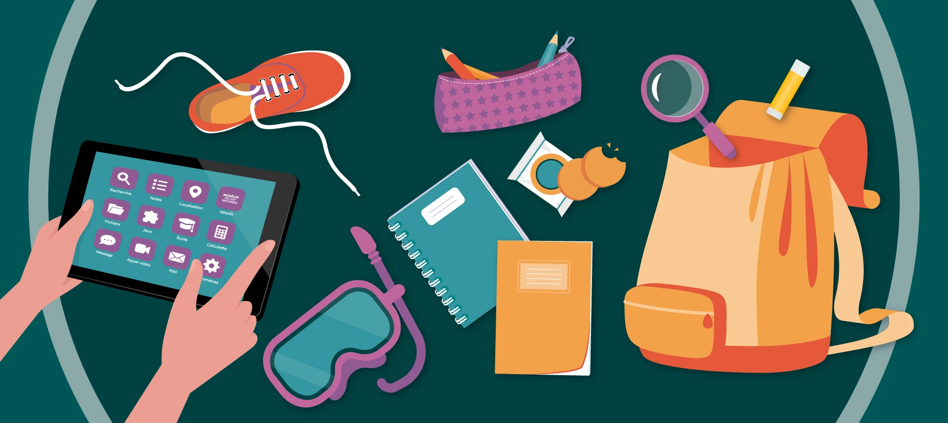 Un carnet, une loupe, mon masque et mon tuba, mon goûter et ma tablette !