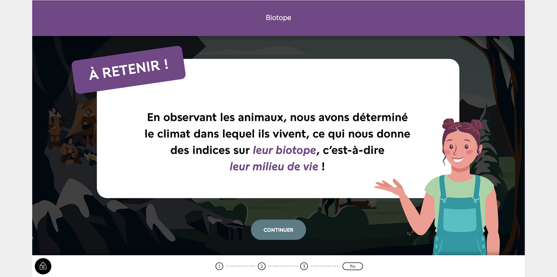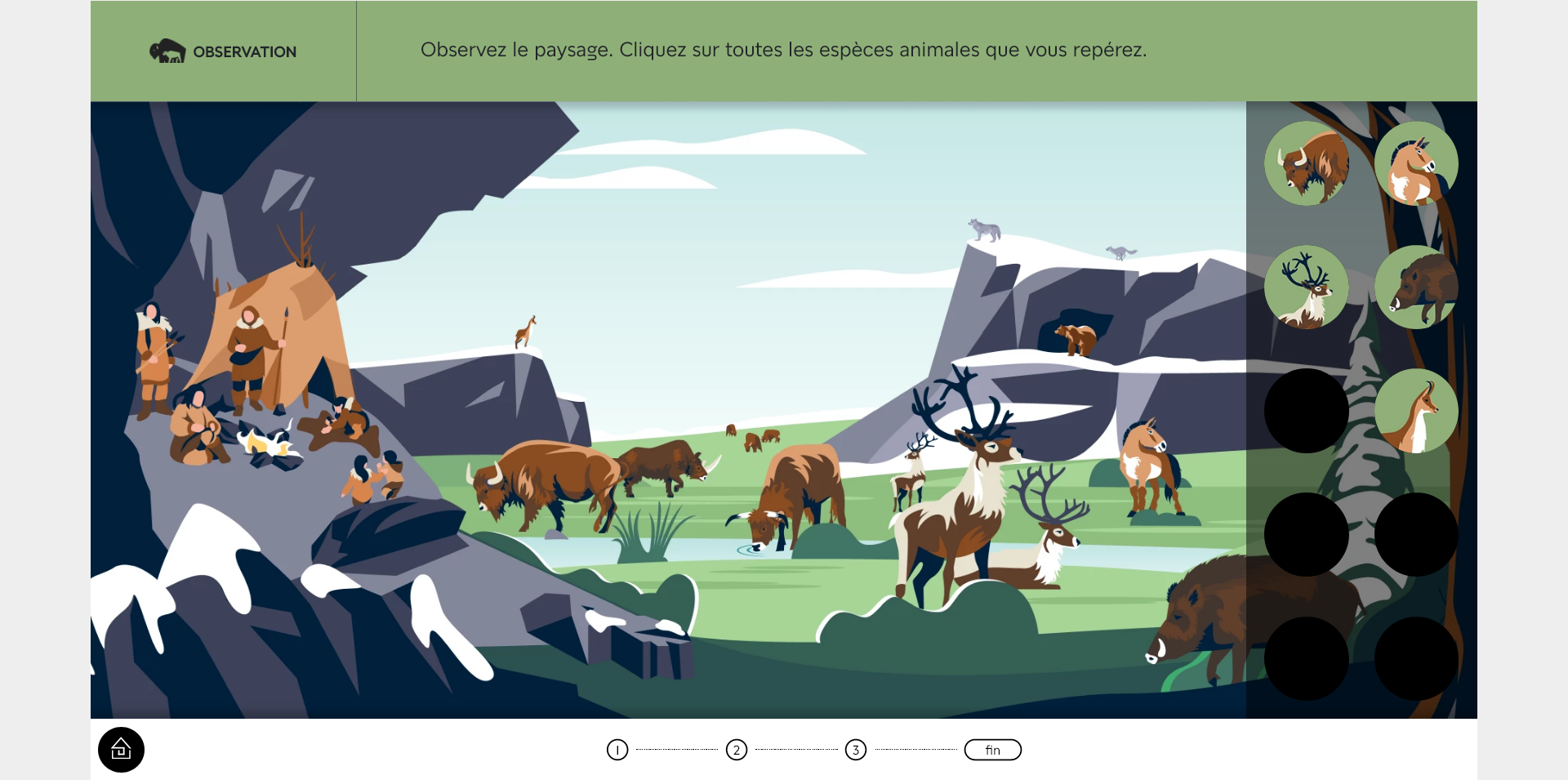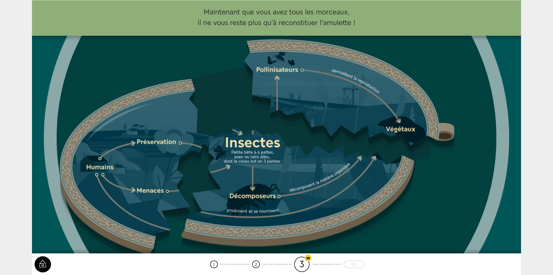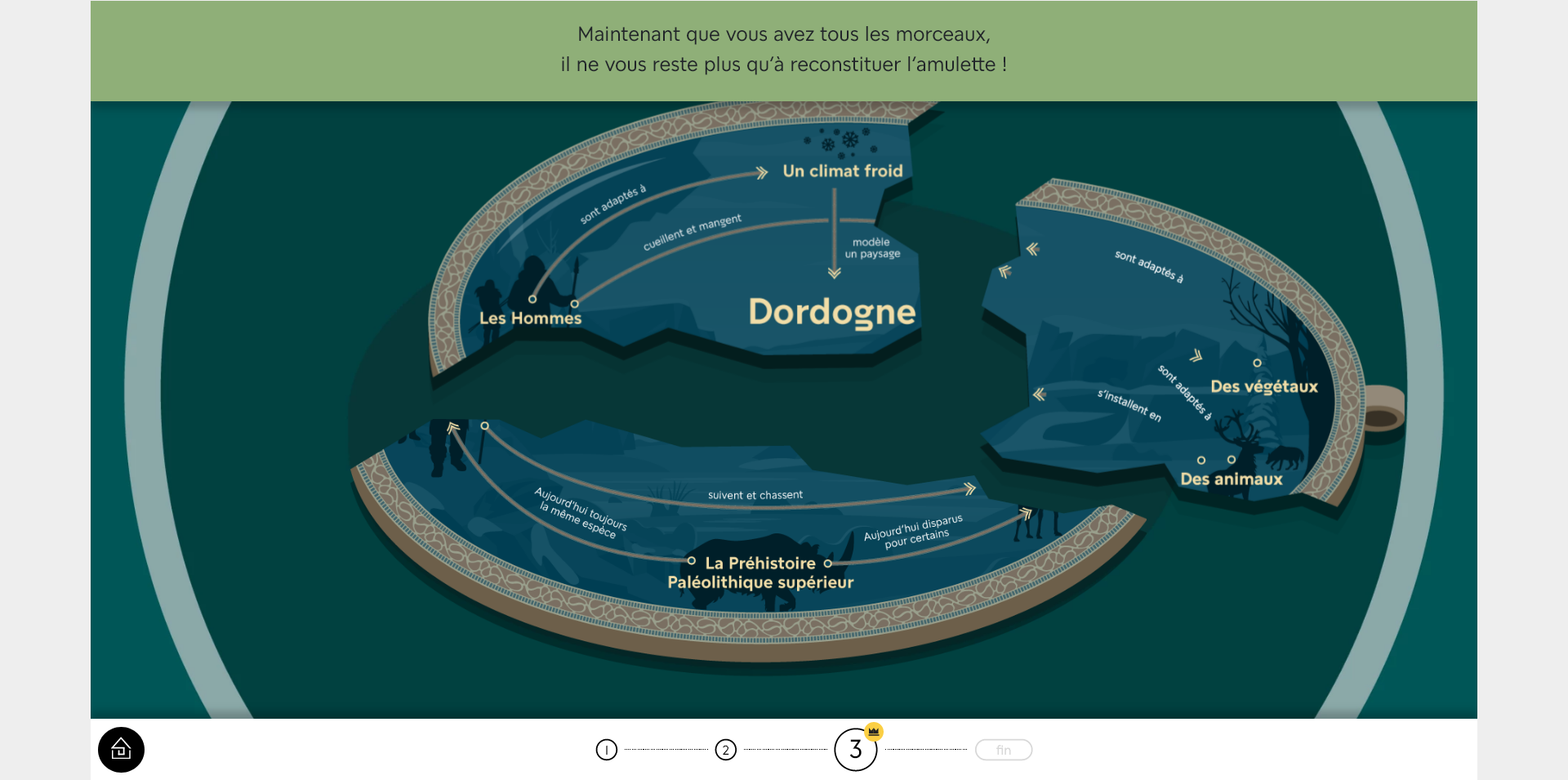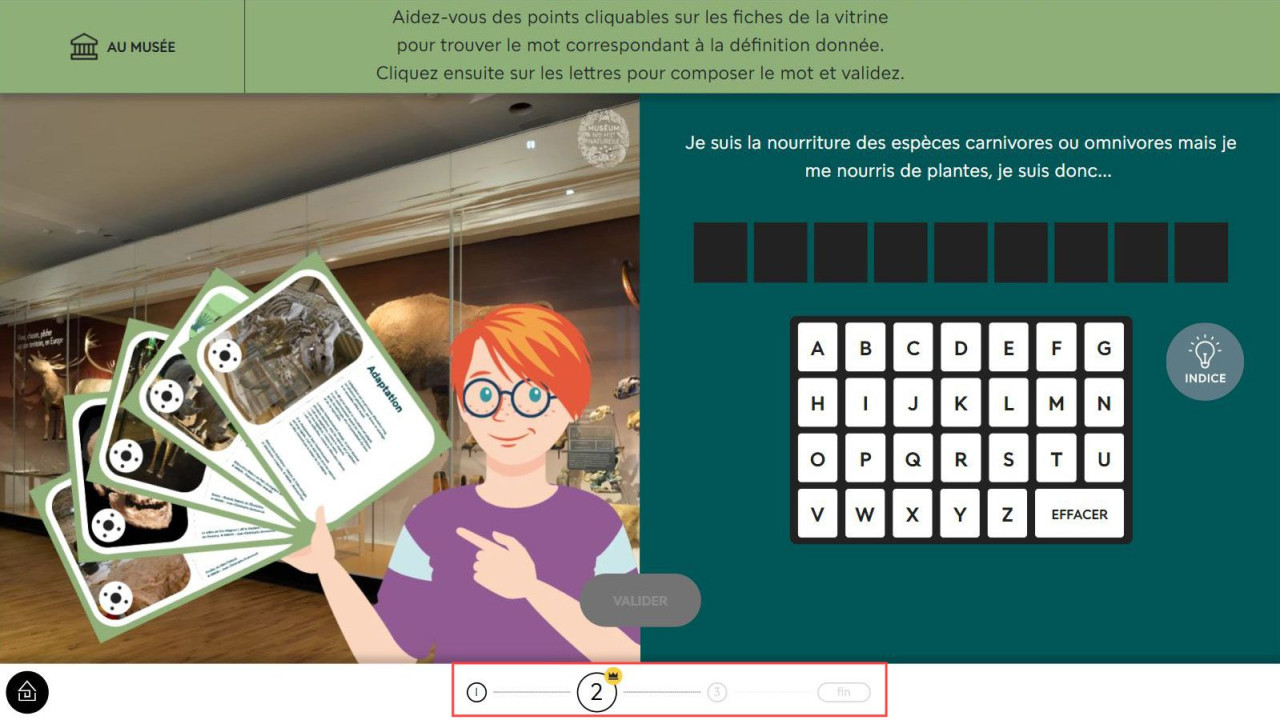 La progression dans une aventure n’étant pas sauvegardée, si vous souhaitez la réaliser en plusieurs temps, vous pouvez rejoindre l’étape en cours en cliquant sur le numéro de l’étape en bas de l’écran.